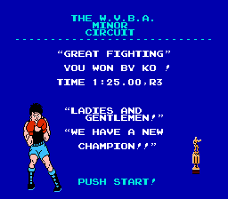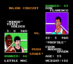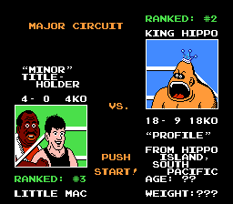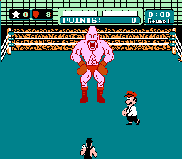Play as Little Mac and take on a slew of boxers like Glass Joe, Bald Bull, and Soda Popinski! Become the champion in the minor, major, and world circuits and take on the man himself, Mike Tyson! (Tyson was replaced in a later release by a fictional character, Mr. Dream). Defeating Tyson has been described by many as one of the most difficult video game accomplishments of all time. Пародийный бокс. Рефери - Марио. Ваши враги - все как один тупые переростки. Соперника вы видите в фас, его-то (фас) ему и надо набить. Бить надо в незащищенные места, другие он закрывает, и тогда удар не достигает цели. Не забудьте защищаться и сами от удара противника. Игра позже переиздавалась в несколько ином варианте, главным отличием которого являлся Майк Тайсон собственной персоной в качестве одного из противников.